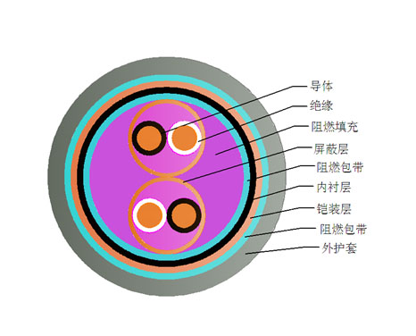 銅芯(輻照)交聯(lián)聚乙烯絕緣無(wú)鹵低煙阻燃熱固性內(nèi)護(hù)套鋼絲編織鎧裝船用儀表回路電纜 |