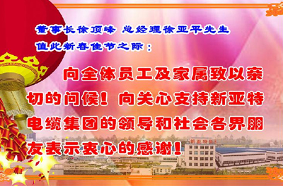 春暉照耀新亞特共繪藍(lán)圖,聚力群譜亞峰牌再創(chuàng)輝煌!帶著勝利的喜悅我們送走了碩果累累的2008年,以?shī)^進(jìn)的豪情迎來(lái)了充滿(mǎn)希望的2009年。值此辭舊迎新之際,我謹(jǐn)代表安徽新亞特電纜集團(tuán)有限公司,向一直關(guān)心、支持新亞特發(fā)展的各級(jí)領(lǐng)導(dǎo)和各界朋友表示衷心的感謝!向一年來(lái)辛勤工作的廣大員工,向默默支持我們工作的職工家屬致以最誠(chéng)摯的問(wèn)候、最美好的祝愿和最崇高的敬意!祝大家在新的一年里身體健康、工作順利、合家幸福、事業(yè)有成!