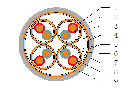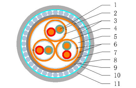 7-繞包總屏蔽8-內(nèi)護套9-鋼絲纏繞鎧裝層10-包帶11-外護套