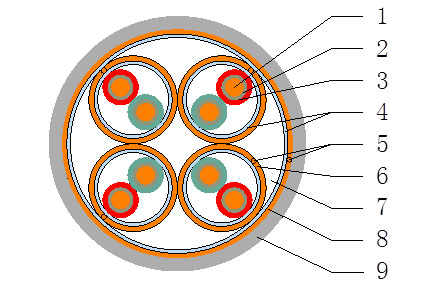 1-導(dǎo)體2-耐火層3-絕緣4-包帶5-引流線6-分屏蔽7-填充8-總屏蔽9-外護(hù)套