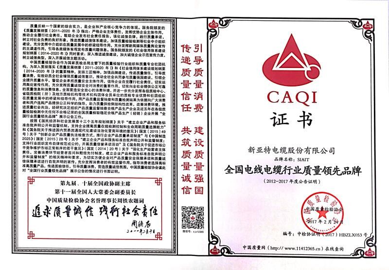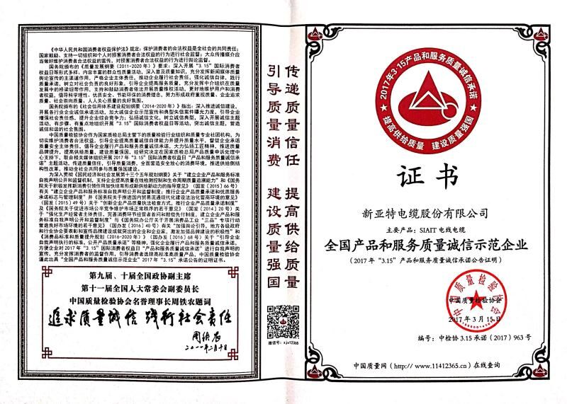 新亞特電纜股份有限公司獲得“全國產(chǎn)品和服務(wù)質(zhì)量誠信示范企業(yè)”稱號和“全國電線電纜行業(yè)質(zhì)量領(lǐng)先品牌”稱號